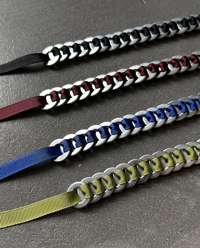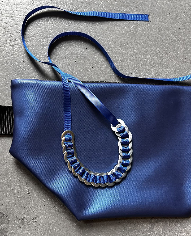N#62bl is our new industrial necklace, featuring 20 steel rings threaded on a blue cord. Each ring has a diameter of 10mm, creating a bold yet balanced statement piece. The necklace is full adjustable – the cord can be tied at different lengths to suite your style and preference. This LOM design statement necklace is perfect for confident, bold, and expressive individuals. Like all our products, the N#62bl RING necklace is unisex and can be worn by both men and women.